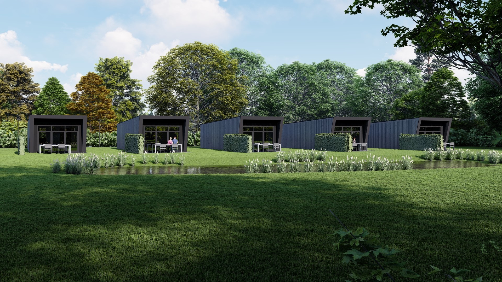 een privé terras. Ze zijn vrijwel geheel van hout gebouwd met